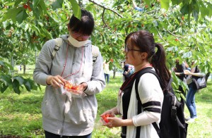 共同作業で高い位置のさくらんぼを取る微笑ましい二人がいたり