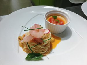メニューは羽幌町の甘えびを使った前菜をシェフに創作して頂き、できた2品は・・・・